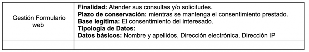 De conformidad con la normativa vigente y aplicable en protección de datos de carácter personal, le informamos que sus datos serán incorporados al sistema de tratamiento titularidad de MICHELLE ADRIANA TORRES DIAZ con NIF 24433309H y domicilio social sito en CALLE MANUEL CORACHAN GARCIA 1 BAJO, 12006 CASTELLON DE LA PLANA/CASTELLO DE LA PLANA(CASTELLON). A continuación, se facilita la información de los tratamientos realizados: