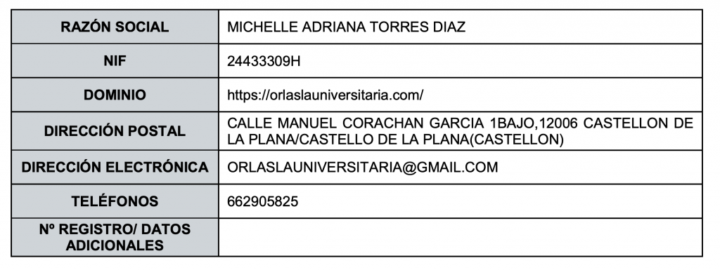 La empresa titular de los dominios web orlaslauniversitaria.com es La Universitaria orlas de graduación, con domicilio a estos efectos en Calle Manuel Corachán García N1 bajo, Castellón de la Plana. Correo electrónico de contacto: info@launiversitaria.com.